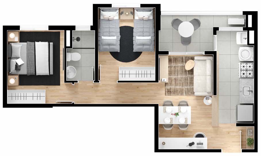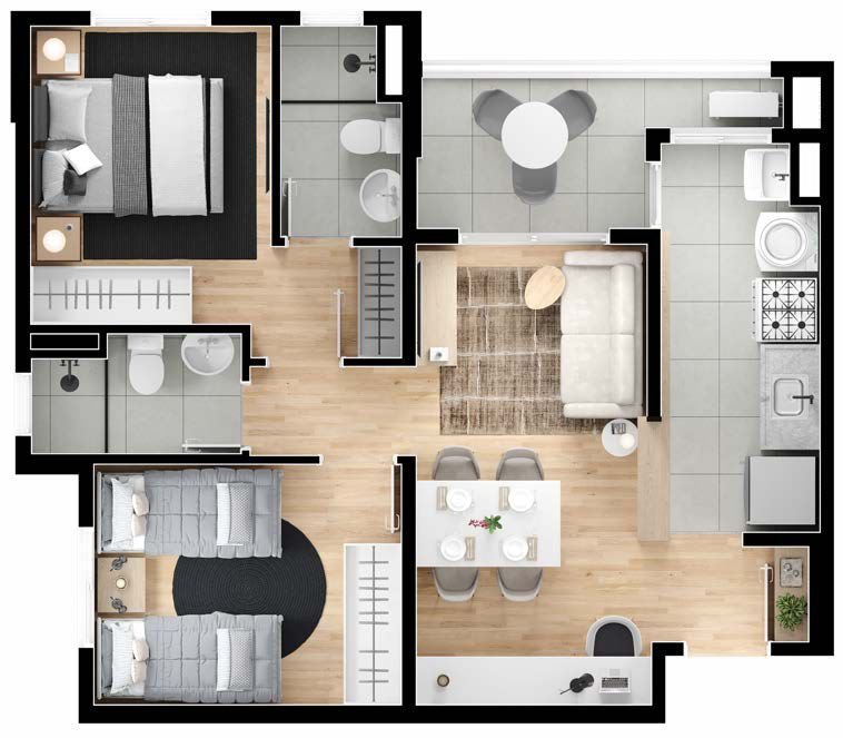 Na entrada de todos os apartamentos existe um espaço para um armário com diversas possibilidades de uso: bar, louceiro, rouparia ou para atender aos novos hábitos de higiene, com sapateira e aparador para acomodar os itens usados fora de casa, conhecido na cultura oriental como “genkan”.