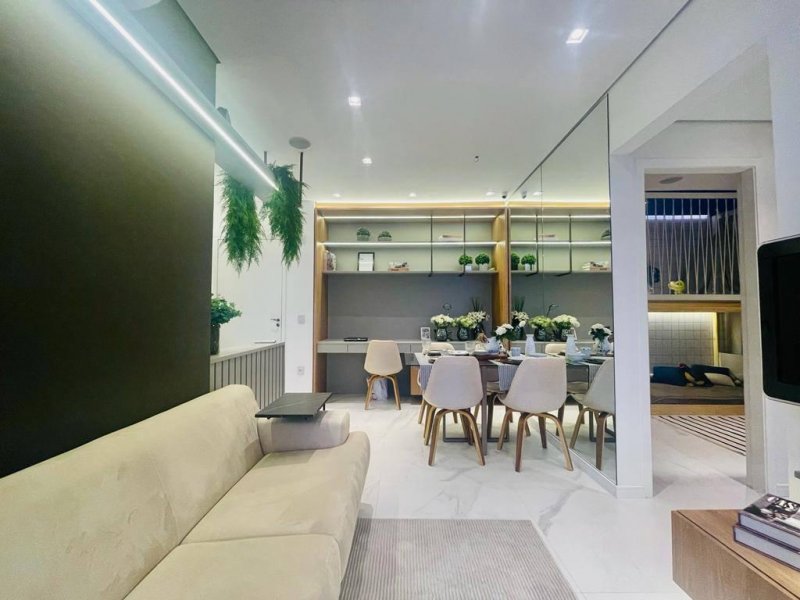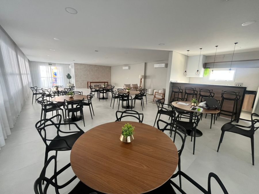 A sala integrada tem espaço para múltiplos ambientes. Além da sala de TV/|estar e jantar, as dimensões permitem a execução de um buffet de apoio ou até mesmo um espaço definido de home office.